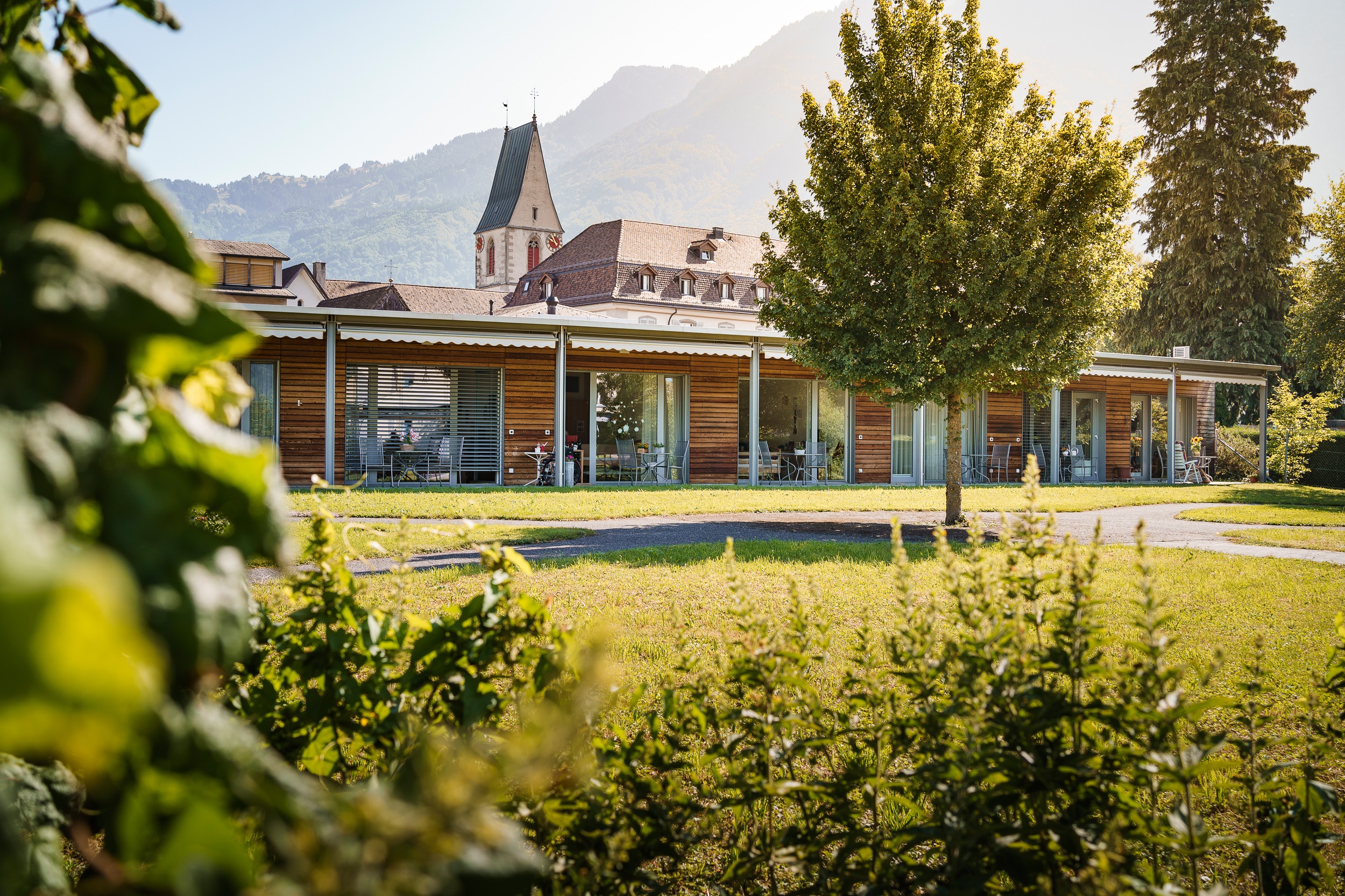 In unserer Pflege- und Betreuungs-abteilung im Neubau besteht der grosse Vorteil, dass jedes Zimmer einen Sitzplatz mit schönem Weit-blick hat. Allein genutzte Doppel-zimmer können wie eine kleine Wohnung eingerichtet werden.